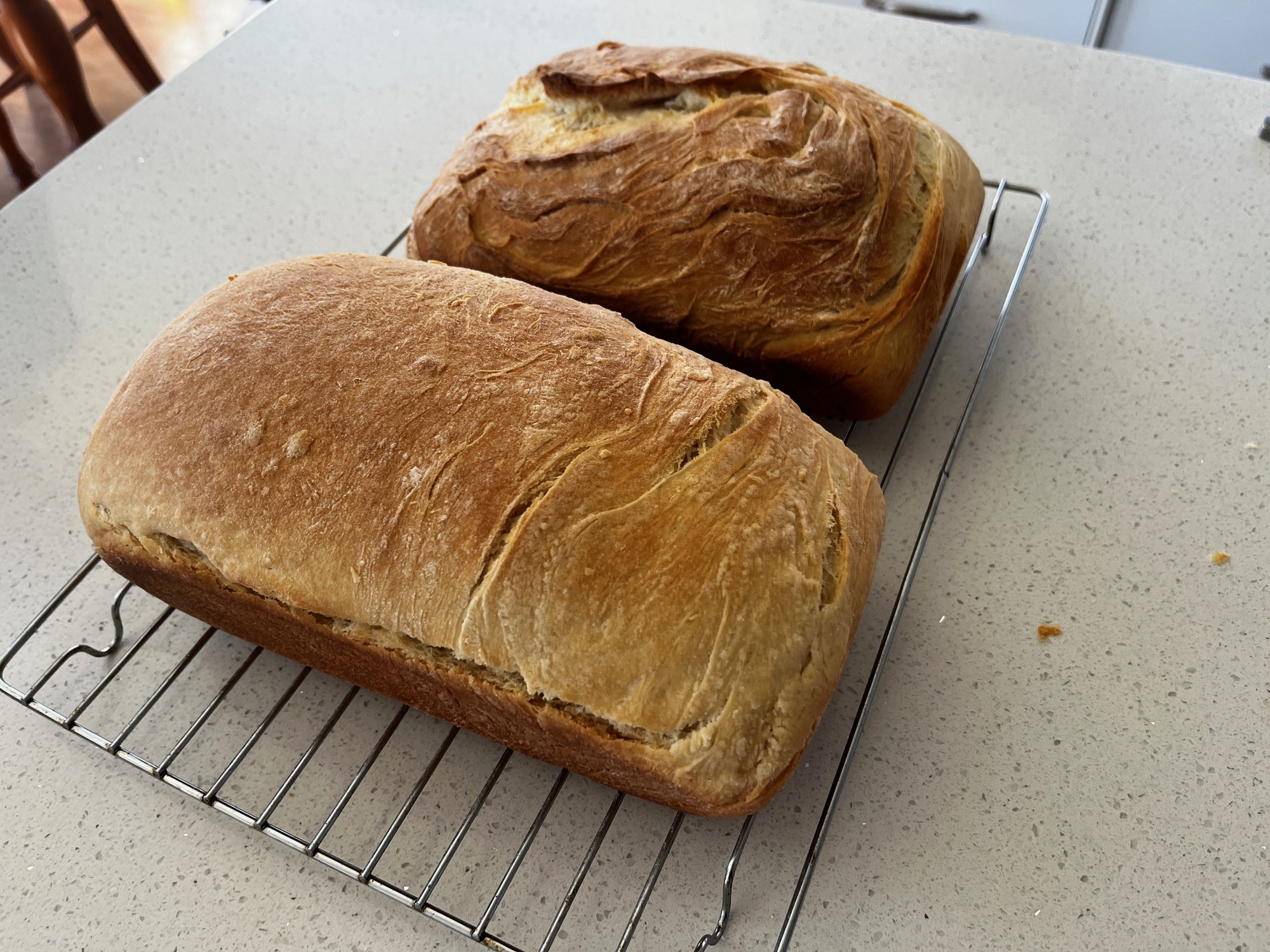 Add to the bread pans and then leave to rise again, spraying the top with oil and putting tea towel back on top. Let rise for about 45 mins until at the top of the pan.