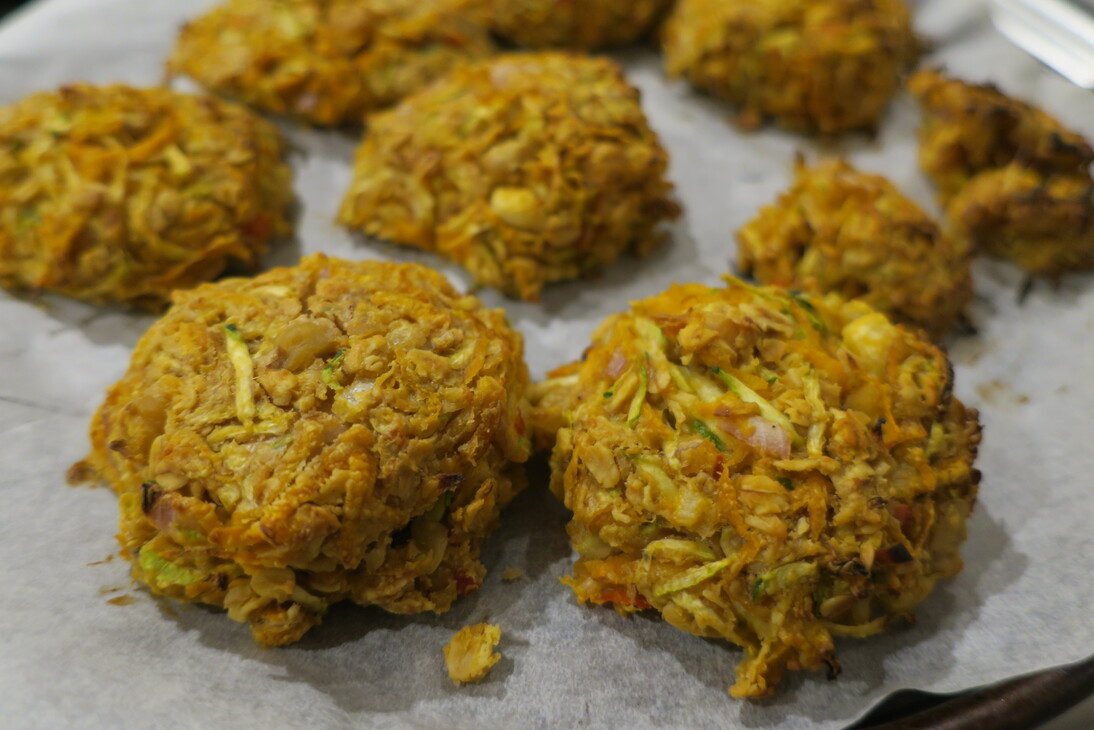 Add vegetables, oats, peanut butter into a bowl and mix.