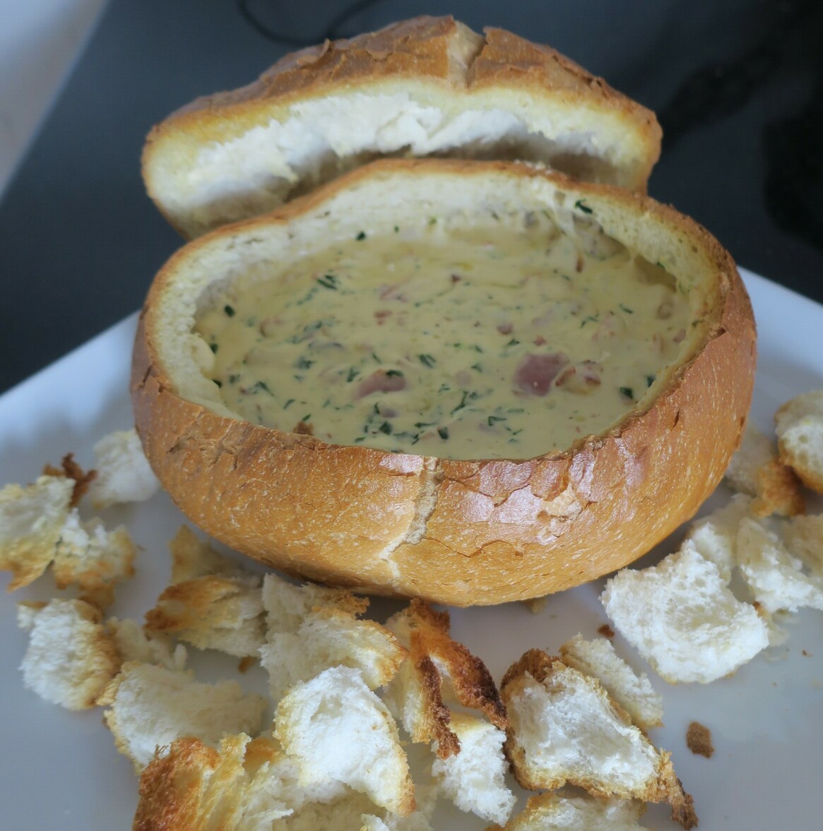 Spoon mixture into loaf. Arrange lid, bread pieces and sliced baguette in a single layer around loaf.