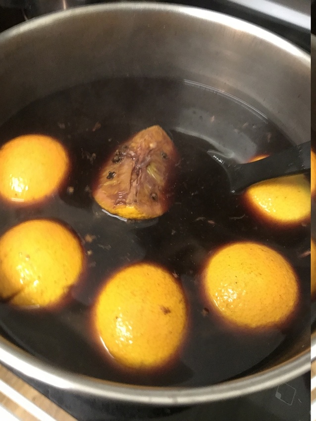10cloves2cinnamon sticks1/4 cupsugar1grated nutmeg2cut up oranges