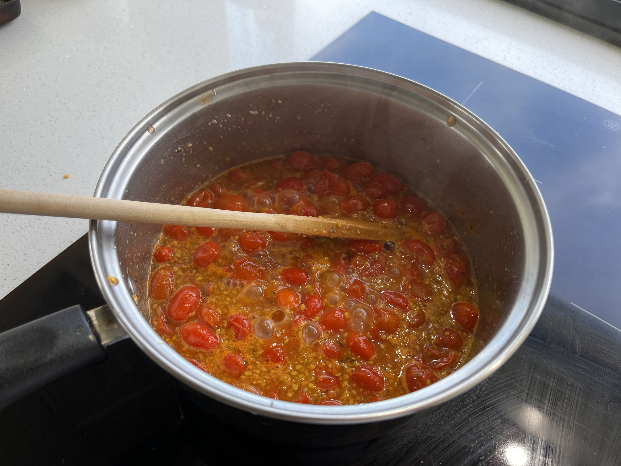 Mash or blend tomatoes in a saucepan